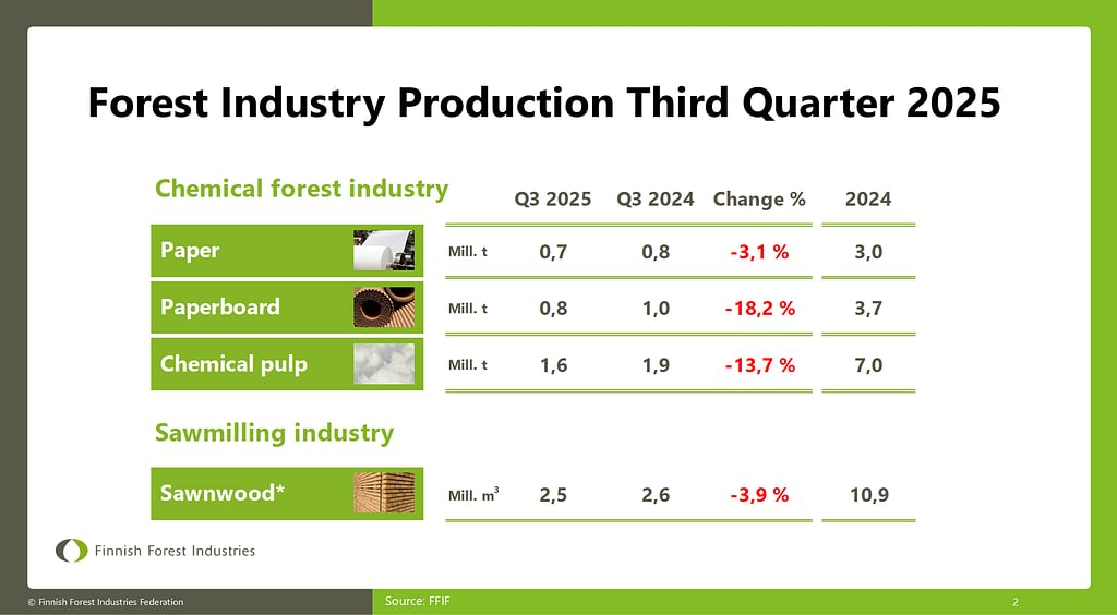 – Global economic uncertainty, which has been exacerbated for the industry by the U.S. tariff rally, was also evident in the forest industry in the third quarter. Production volumes of paper, paperboard, and pulp also declined across Europe during this period. The sector is currently experiencing challenging times, but last week there was finally some good news from the EU policy front. The EU’s new bioeconomy strategy is promising and headed in the right direction. There is clearly a growing understanding of the use of renewable, biodegradable, and recyclable materials on an industrial scale as a source of European competitiveness and sustainable growth, notes Maarit Lindström, Chief Economist of the Finnish Forest Industries Federation.