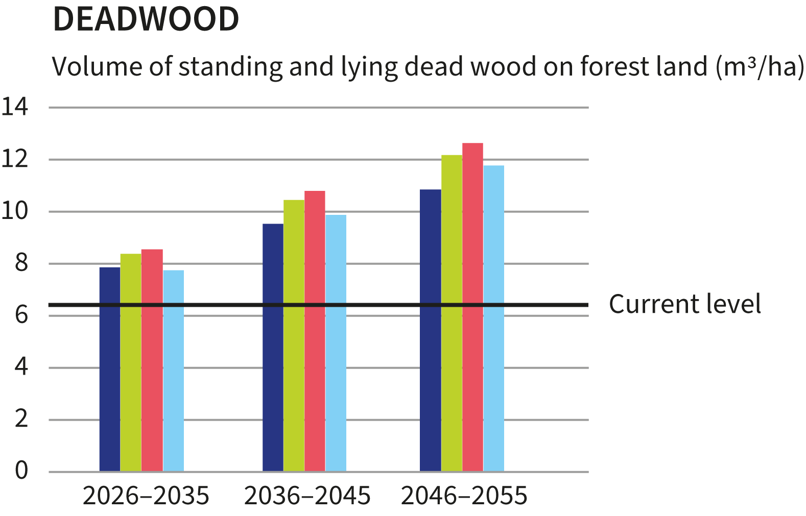 It may even double. Currently, there is an average of 6,6 m3 of dead wood per hectare on forest land (forests available for wood supply and protected forests, National Forest Inventory 13). Measures in managed forests play an important role in achieving the goal of the National Forest Strategy 2035 by increasing the total amount of dead wood towards 10 m3 per hectare.