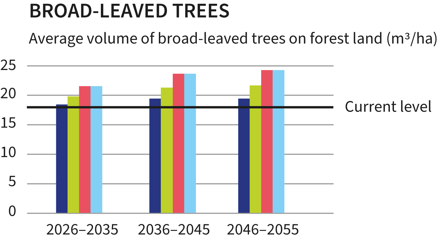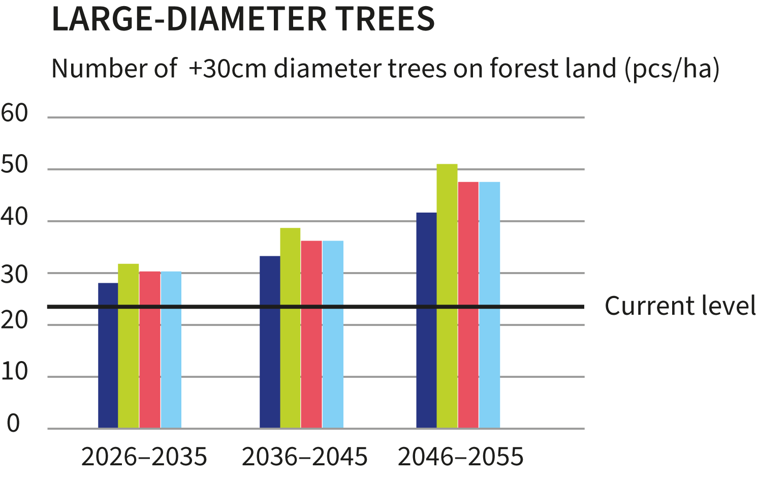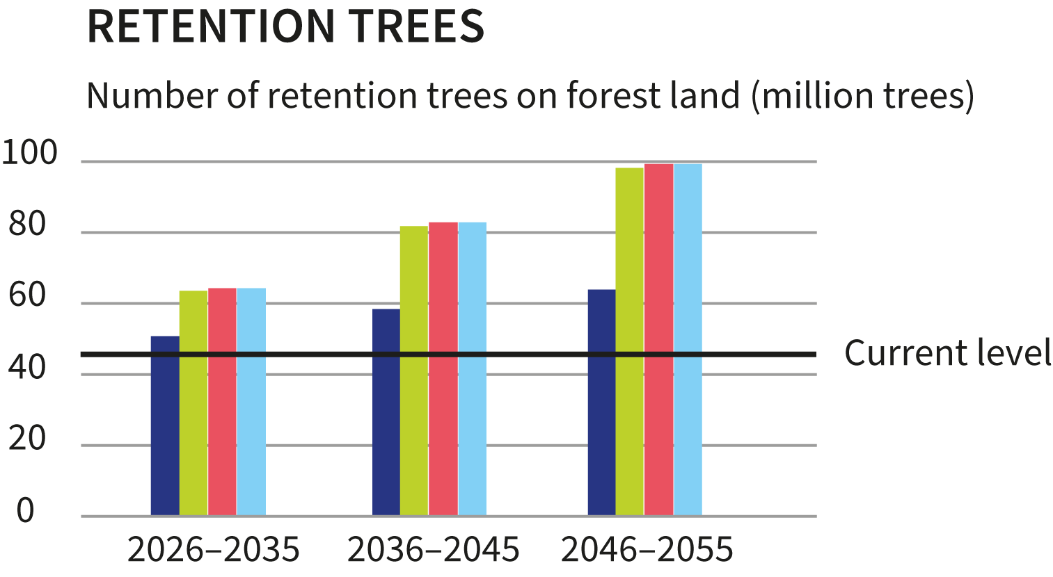 In 2055, our forests may contain up to twice the number of retention trees compared to the current state. This is partly reflected in the number of large-diameter trees.