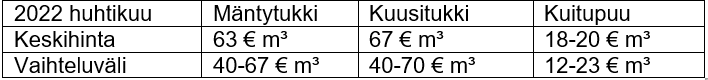 Havutukkien kantohinnat olivat huhtikuussa 2 prosenttia korkeammat kuin maaliskuussa. Koivutukin kantohinta oli samalla tasolla kuin maaliskuussakin. Kuitupuiden kantohinnat olivat 1–2 prosenttia korkeammalla kuin maaliskuussa.