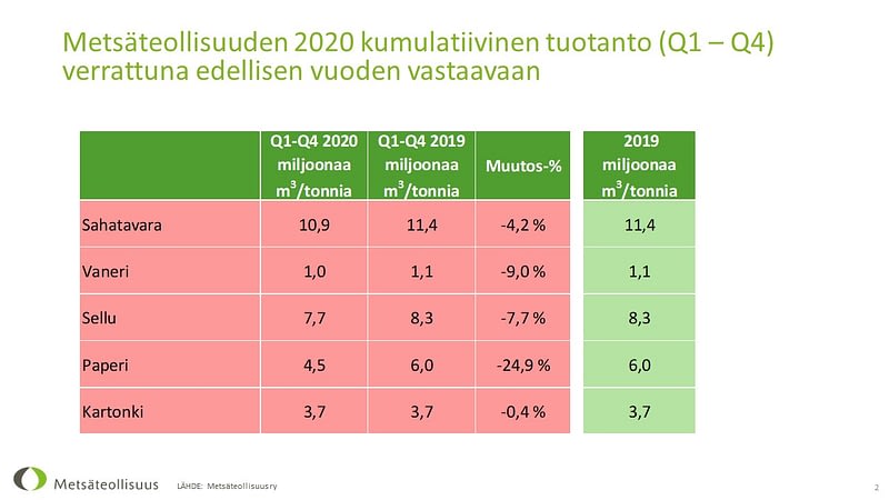 Metsäteollisuuden tuotannossa alkoi näkyä toipumisen merkkejä vuoden 2020 viimeisellä neljänneksellä loka-joulukuussa. Sahatavaran, vanerin ja kartongin tuotanto kääntyi kasvuun, mutta sellun ja paperin tuotanto laahasivat vielä viime vuoden vastaavasta ajankohdasta. Kokonaisuudessaan vaikean vuoden tuotantolukuja painovat ensin raskaat lakot ja sitten korona, näkymät kuitenkin paranivat vuoden loppua kohden.