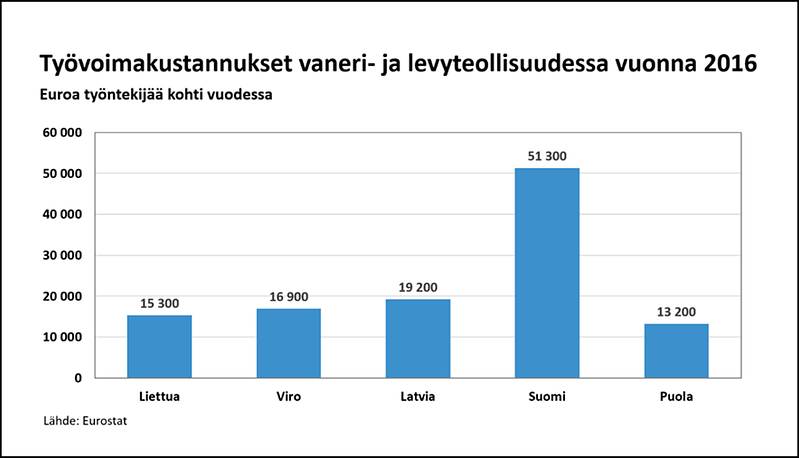 Samanlaiselta takamatkalta kansainväliseen kilpailuun lähtevät mekaanisen metsäteollisuuden sahat ja vaneritehtaat, joiden pahimmat kilpailijat tulevat huomattavasti alhaisemman kustannustason maista, kuten Venäjältä, Baltiasta ja Puolasta.Suomen vaneri- ja levyteollisuudessa työvoimakustannukset nousevat työntekijää kohti yli 50 000 euroon vuodessa, kun esimerkiksi Virossa ne ovat alle 17 000 euroa vuodessa.