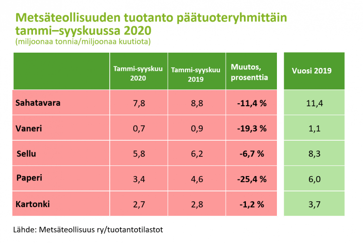 Metsäteollisuuden tuotanto aleni Suomessa kaikissa päätuoteryhmissä heinä–syyskuussa, kun koronakriisi vaimensi yhä kansainvälistä kysyntää.
