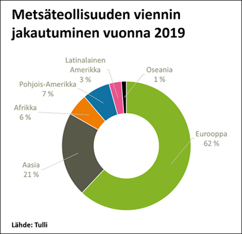 Reilut 60 prosenttia metsäteollisuuden koko viennistä suuntautui Eurooppaan ja noin viidennes Aasiaan. Sekä Euroopan että Aasian osalta viennin arvo laski 6 prosenttia.