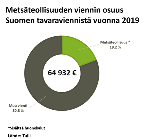 Metsäteollisuuden viennin osuus Suomen tavaraviennistä supistui 19,2 prosenttiin, mikä on 1,5 prosenttiyksikköä vähemmän kuin vuonna 2018. Viennin euromääräinen arvo pieneni lähes kaikissa metsäteollisuuden päätuotteissa.