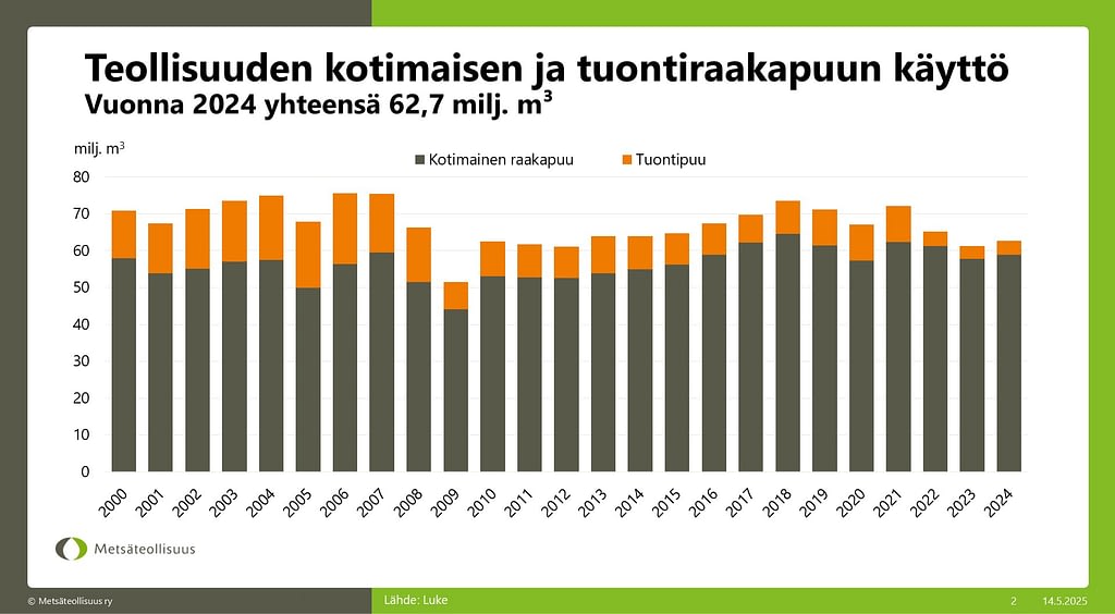 Valtaosa metsäteollisuuden tarvitsemasta puusta ostetaan kotimaasta. Sitä on täydennetty tuontipuulla.