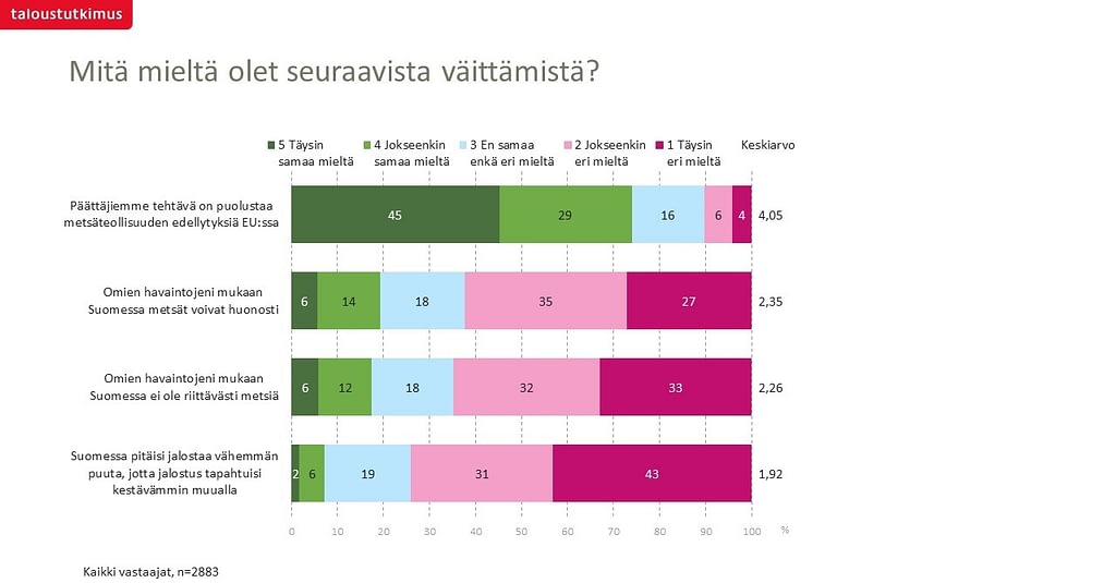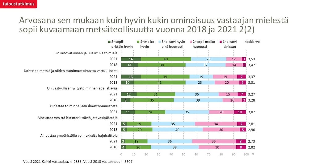 Taloustutkimus haastatteli elokuussa lähes 3000 henkilöä Metsäteollisuus ry:n toimeksiannosta. Kyselytutkimuksen päätulos on, että suomalaisilla on entistä myönteisempi näkemys metsäteollisuudesta, ja jo aiemmin hyvä maine on entisestään vahvistunut. Näkemykset metsäteollisuuden roolista niin työllistäjänä, vientiteollisuudessa, verojen maksajana ja aluetalouden vahvistajana sekä suomalaisen hyvinvoinnin rakentajana arvioidaan nyt selvästi merkittävämmäksi kuin kolme vuotta sitten.