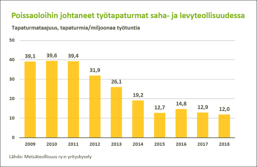 Myös kokonaisuutena alan työturvallisuuskehitys on ollut erittäin hyvää. Viime vuonna paperiteollisuudessa poissaoloon johtaneita tapaturmia oli 5,2 laskettuna miljoonaa työtuntia kohden, kun vuotta aiemmin luku oli 7,6. Saha- ja levyteollisuudessa tapaturmien taajuuslukema oli viime vuonna 12,0, ja edellisvuonna 12,9.