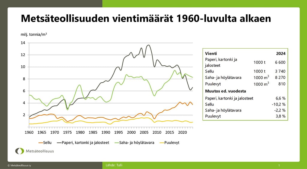 Metsäteollisuuden vientimäärät tuotelajeittain 1960–2024.